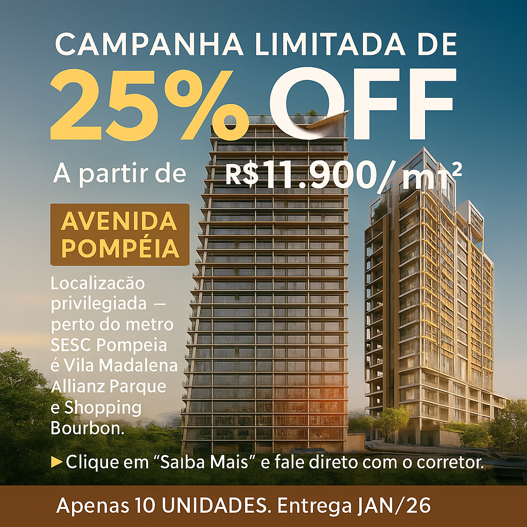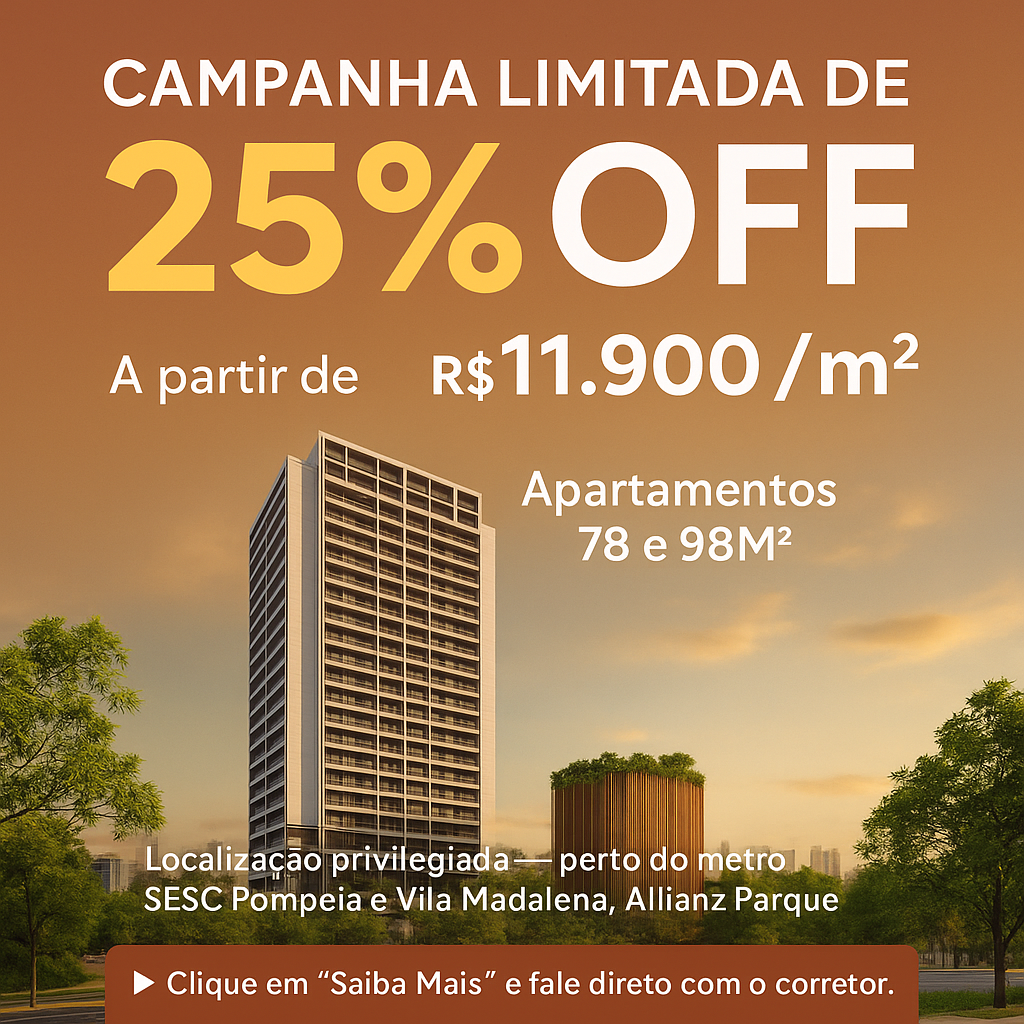 Campanha Limitada de 25% OFF A partir de R$ 11.900/m²Apartamentos 78 e 98M² Localização privilegiada — perto do metrô sesc pompeia e vila madalena, Allianz Parque e Shopping Bourbon. entrega janeiro 26 ?? Clique em “Saiba Mais” e fale direto com o corretor. Apenas 10 Unidades. Entrega JAN/26